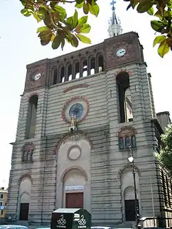The Church of the Sacred Heart and St. James of Carignano was built between 1892 and 1914 to a design by Luigi Rovelli, in the square then named after Nino Bixio.[48] The original design underwent radical changes during construction. In 1896 the large crypt hall was completed, where the church temporarily began to function. Between 1902 and 1914 above this room, which has housed the Teatro Carignano since 1969,[49] the church proper was raised, decorated in the 1920s, when the altars were also made.[41][50]