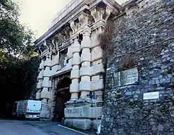 Sixteenth-century walls. These walls were built between 1320 and 1327 and include the section from the Ponte Monumentale to the Grazie walls, encompassing the entire hill of Carignano; this section of wall, preserved only in part, was restructured, but keeping the same route, in the first half of the sixteenth century to adapt it to the new defense techniques, with the contribution of famous military architects of the time, such as Giovanni Maria Olgiati[55] and Antonio da Sangallo. From the Porta degli Archi (or St. Stephen's) gate, which stood where the Monumental bridge is and with the 16th-century renovation replaced the older Porta dell'Olivella, the walls of St. Clare, along whose route runs Corso A. Podestà. This was followed by the Capuchin walls. Between the two stretches of walls, on an ancient service gate was rebuilt the Porta degli Archi. At the end of the Capuchin walls, at the southwest limit of the walled city cell, stood the Bastion of the Witch, where a cannon battery was later installed. From here the walls continued under various names (Strega's, St. James's, St. Margaret's, and Marina walls) on the sea cliffs to the Seno di Giano, connecting with the older city wall. The sea walls have for the most part disappeared with the urbanization of the area and the creation of the sea ring road: a few remnants can be seen on which stands the loggia of Villa Mylius.[5][8] The Walls of St. Clare and the Capuchins were named after two convents that stood nearby. The one of St. Clare, dating from the mid-17th century, closed in 1797 by the Ligurian Republic, was demolished in the late 19th century after a brief reopening in the middle of the century; that of the Capuchins, on the other hand, was demolished in the 19th century for the construction of the Galliera Hospital.[2][5]