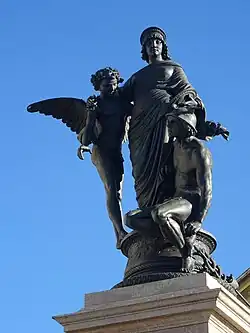 Setting aside an earlier design by Giacomo Brusco, the new democratic government commissioned Carlo Barabino, who built an elaborate neoclassical structure next to the Servi church.[2] The pediment bears the Jacobin-inspired inscription, “To the Sovereign People - Liberty - Equality - The Builders the First Year of the Democratic Ligurian Republic MDCCXCVII.”[8][40]