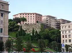 The scenic promenade of the Cappuccine walls, once a historic viewing station of the Mura del Prato, also called Fronti Basse, the mighty embankments in the plain of the Bisagno that connected the sea fortifications with the seventeenth-century city walls, is an important lookout over the Piazza della Vittoria below, with a backdrop of the Albaro and Monte hills.[8]