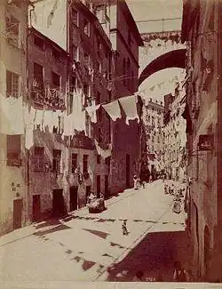 Before the nineteenth-century urban development, the hill of Carignano could only be reached by steep cobblestones, the typical Ligurian creuze, some of which, such as Salita San Leonardo, Salita Santa Maria in via Lata, Via San Giacomo di Carignano, and Salita dei Sassi, have partly survived urbanization, although intersected by the modern road system.[9] Almost nothing, however, has remained of the streets and alleys of the Hill area (between Via Madre di Dio and Via del Colle).
