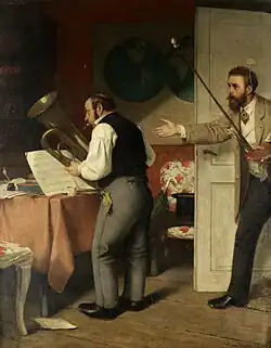 His best known, and most controversial, painting was the satirical Jung-Deutschland in der Schule (Young Germany in School), depicting students in a geography class. Max Jordan, the Director of the National Gallery, thought highly of it and bought it for the museum in 1874. That same year, a critic for the magazine, Dioskuren, which was a major promoter of the "Young Germany" ideology, saw the scene as a political issue and described the classroom as a "nursery school for budding convicts as future citizens", not a satire on their movement.[4]