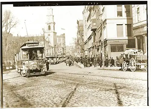 Henry James approved of Schoenhof & Moeller, describing it in 1878 as "a vastly better shop than any of the kind in London."[3] Around 1889, "Mr. Schoenhof [was] the general agent for the United States for Hachette & Co.'s (London and Paris) publications for the study of foreign languages ... [and] for Henry Holt & Co.'s (New York) publications. ... [He also sold] Steiger & Co.'s, Wm. R. Jenkins', Geo. R. Lockwood & Son's, MacMillan's, Appleton's, Barnes' publications in foreign languages."[4] Schoenhof's shop was located near the corner of Tremont and Winter Streets: at no.40 Winter St. (1875–1876),[5] no.146 Tremont (1880–1881),[6] no.144 Tremont (1887–1889),[7] and no.128 Tremont (1902–1911).[8] In 1893 he "sold out his interest to two of his employees, who continue[d] the business under the firm-name of Castor & Co."[9][10]