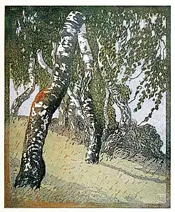 Thiemann left an extensive oeuvre ranging from painting to all forms of printmaking. He is best known for his color woodblock prints of landscapes featuring trees (especially birch trees) and city streets, all rendered in a strongly graphic style with subtle coloration.[1] His work was influenced by Martha Cunz's woodcuts, and it has stylistic affinities with such artists as Ferdinand Mirwald and Frances Gearhart.[2]