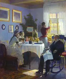 Thomsen exhibited in Carlottenborg from 1869. His earlier works include the genre paintings Ved eksamensbordet (At the Examination Desk, 1874) and Moder og datter (Mother and Daughter, 1875). In 1888, his Middag i en præstegård efter en bispevisitats (Dinner in a Rectory after a Bishop's Visit) earned him several awards including the Neuhausen Prize and gold medals in Munich and Antwerp. Unlike some of his contemporaries, Thomsen did not follow any of the modern trends from Paris but maintained his Historicist approach, often painting literary subjects.[3]