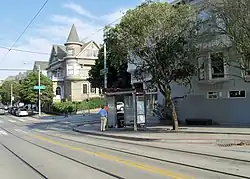 Carl and Stanyan station is a light rail stop on the Muni Metro N Judah line, located in the Cole Valley neighborhood of San Francisco, California. The station opened with the N Judah line on October 21, 1928. It is located two blocks away from Kezar Stadium. The station has a transit bulb in the eastbound direction, which extends the sidewalk of Carl Street, to meet trains like a side platform, allowing passengers to board or depart from trains. In the westbound direction, passengers wait on the sidewalk and cross a lane of traffic to board trains. The station is not accessible to people with disabilities.