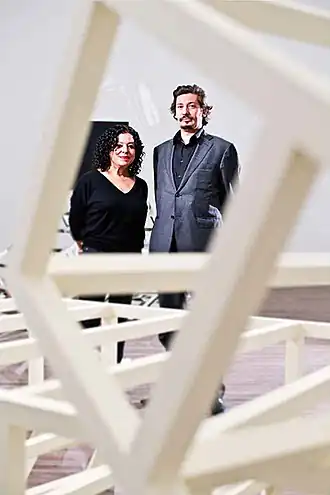 Carla Arocha (born 30 October 1961) and Stéphane Schraenen (born 19 September 1971), also shortened to Arocha & Schraenen, are an artist duo that collaborates since 2006. Arocha & Schraenen work across media, producing paintings, drawings and prints. Large-scale mirrored and interactive sculptural installations are at the core of their collaborative project. Their abstract installations and sculptures stem from everyday objects. The artists strip such objects from functionality, thus reducing them to their basic essence and form. Engaging with the rich tradition of geometrical abstract and optical art, the artists’ works are often placed in a spatial context where light and reflection play a crucial role.[1]