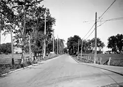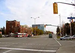 At approximately 19 km (12 mi) in length, Carling Avenue begins at the fringes of the Glebe neighbourhood and runs in a straight direction west until the Ottawa River where it bends north to go around Crystal Bay and Britannia Bay and ends north of Kanata. It used to begin at O'Connor Street, one block east of Bank Street, but the part east of Bronson was renamed Glebe Avenue on February 7, 1974.[1] It is a four to six-lane principal arterial road for most of its urban length, with a speed limit of 60 km/h (37 mph). The portion through the Greenbelt and into Kanata is generally a two-lane rural highway (although widening is planned, which would also remove a substandard underpass in the 3700 block about midway between March Road and Moodie Drive), with a speed limit of 80 km/h (50 mph).