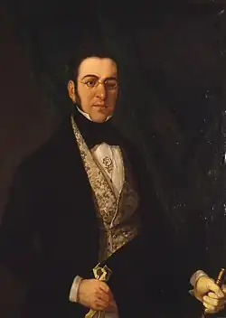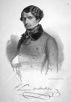 Among the writers excelling as authors of satires the one re-appearing in numerous works as the most prominent one is Jose Robreño y Tort. He made his name as author of theatrical pieces already in the mid-1820s; venomous caricatures of "los serviles", e.g. La Regencia de la Seo de Urgell o las desgracias del padre Liborio (1822) might be considered pre-configuration of his later anti-Carlist dramas and perhaps the first pieces of anti-Carlist literature.[5] Robreño's brief works written during the conflict were again intended for popular audience and are known to have been played in Barcelona in the 1830s.[6] Another Liberal author of the same genre is Manuel Bretón de los Herreros, recognized for the anti-Carlist comedy El plan de un drama (1835).[7] Among the dramas set in history there is El trovador by Antonio García Gutiérrez (1836), Antonio Pérez y Felipe II by José Muñoz Maldonado (1837), Doña Mencia by Juan Eugenio Hartzenbusch (1838)[8] and Carlos II el Hechizado by Antonio Gil y Zárate (1837); especially the last one was a success among the public.[9] The Carlist response is little known; it seems that Carlist values were defended generally "por el teatro conservador católico".[10] The best known author of this breed is José Vicente Alvarez Perera, high Carlist official during the war and also a poet, author of Calendario del año de 1823[11] and Palabras de un cristiano.[12] José Zorilla was sympathetic to Carlism and even briefly stayed at the Carlist court, yet in his theatrical pieces he did not touch upon the issue.[13]