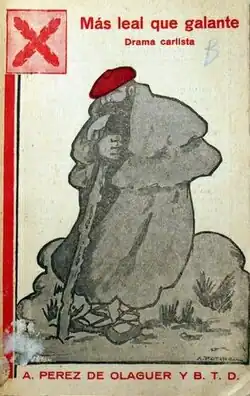 Drama lost importance as political battleground already in the mid-19th century, yet echoes of Carlism-related debates were heard also among the playwrights. Among the spate of pro-Republican theatrical pieces of the 1920s or even more militantly left-wing dramas of the early 1930s many contained more or less explicit Carlist threads. Because of its author a good example is La corona (1931) by Manuel Azaña; it featured a Traditionalist, Aurelio, who first leads a coup against the legitime ruler and then murders a Liberal protagonist.[252] Works written by the Carlists were far less popular, staged on local scenes, Carlist circulos or religious establishments. Within this realm a particular position was held by Manuel Vidal Rodríguez, related to the Integrist breed of Traditionalism. In three first decades of the 20th century, he was contributing as a prosaist and publisher, though especially as a playwright; his dramas embrace religious topics in historical setting, like La Reina Lupa (1924).[253] His stand in the realm of letters, however, stemmed rather from his role as professor of lengua y literatura castellanas in the University of Santiago de Compostela.[254] Sympathy for Carlism is clearly visible in early works of José del Rio Sainz;[255] they climaxed in his poema dramático La amazona de Estella (1926),[256] considered a Carlist homage.[257] There were also a few, usually young people associated with Carlism who tried their hand as playwrights. Antonio Pérez de Olaguer made his name within the Carlist realm of the early 1930s as a novelist and essayist, though he contributed also to drama. Together with Benedicto Torralba de Damas he was the author of Más leal que galante (1935), a fairly unique, explicit theatrical Carlist manifiesto which earned him the status of a party literary celebrity.[258] Few militant and moralizing dramas classified as costumbrismo nostalgico[259] were written by Jaime del Burgo. Today plays like Lealtad (1932), Cruzados (1934), Al borde de la traición (1936) are considered "ejemplos de teatro carlista tradicionalista”,[260] with their key objective identified as presenting genuine Navarre and its customs as the fortress of traditional values.[261]