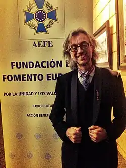 The author whose poetic contribution to the Carlist cause is by many considered of greatest literary value – not only in terms of contemporary poetry but in terms of 200 years of Carlist history – came from a somewhat unexpected side. José Antonio Pancorvo was a Peruvian author of various prosaic volumes, yet he gained recognition for his unique poetry, considered baroque or neo-baroque in terms of style[394] and millenarian, mystic and prophetic in terms of breadth.[395] His volume Boinas rojas a Jerúsalem (2006) combines unique technique with militant Carlist zeal; the volume was dedicated to Comunión Tradicionalista and Sixto Enrique de Borbón.[396]