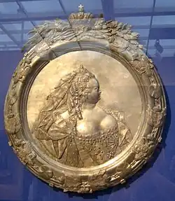 In 1719, Rastrelli made a mask of Peter's face, which he used in his work on three busts of Peter: in bronze (currently in the Hermitage), in wood (for a military ship) and in gilded lead (currently in the Copenhagen Museum).[3][2] The bronze bust was cast in 1723, and its details were refined in 1729 by an assistant of Rastrelli.[4]