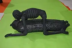 Carlomagno’s work is always done completely by hand with the aim of not repeating a piece he had done before exactly. After modeling, the piece is left to dry completely then fired in an underground oven. This oven is completely sealed to limit the amount of oxygen inside and allows for the black color of the pieces.[1][5] In 1990, during the Encuentro Nacional de Arte Joven in Aguascalientes, Carlomagno’s work caught the attention of painter Manuel Felguérez and art critic Teresa del Conde, who debated whether Carlomagno should be considered an artist or artisan. Oaxaca painter Francisco Toledo considers him to be an artist and has worked to get his pieces shown in Europe.[1][6]
