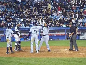 In 2008, Peña had .227 batting average and 11 home runs in 207 at-bats through June 4, 2008. A day after going 2-for-3 with a home run and three runs batted in against the Boston Red Sox, Peña was placed on the fifteen-day disabled placed on June 4, 2008 due to a broken finger. He returned to action from the disabled list on June 27, and finished the season with a .247 batting average, 31 home runs, and 102 RBIs.[6] Peña homered once every 15.8 at-bats, the highest ratio on the Rays.[10] One of his home runs, on September 19 against the Minnesota Twins, was the result of the first call overturned by instant replay in MLB history.[11] After the 2008 season ended, he was awarded his first (and also the first for a Tampa Bay Rays franchise player) AL Gold Glove.