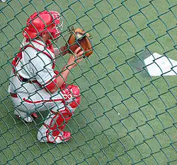 Ruiz realizes the importance of his role with the Phillies, opining, "It's the catcher's job to bring energy and happiness to the game."[2] Ruiz has a good throwing arm that has improved over the years;[3][67] over the course of his career he has thrown out 29% of attempted base stealers, which is exactly the average percentage of baserunners thrown out by catchers.[9]