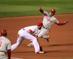 Despite his struggles at the plate during the regular season, Ruiz was an integral part of the Phillies' postseason success.[14] After the Phillies clinched the 2008 National League Championship Series, he commented that the glory of winning a crucial baseball game that clinched the series, which he had witnessed while growing up in Panama on television, "happened to me", noting the aura of the moment, and that it culminated and validated the hard work he had put in over the years.[15] Subsequently, in game 3 of the 2008 World Series, Ruiz tapped a ground ball up the third-base line for a walk-off infield single, the first in MLB history.[14] Ruiz noted, "I heard them cheering. And that's when I knew, 'Okay it's over' ... I'll take a win."[16] The Phillies eventually won the World Series for the first time since 1980, doing so in five games, the last of which began on October 27 and ended on October 29 after it was suspended part-way through due to rain.[17][18] For his performance in the playoffs, he earned the nickname "Señor Octubre" (Mr. October in Spanish).[2]