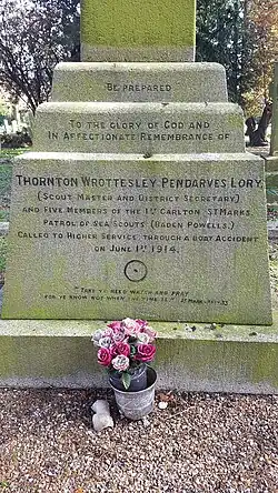 A memorial monument, sculpted by James E Proudfoot, was erected above the grave. A square enclosure of granite kerb stones includes six small headstones with the names and ages of each person who died in the accident.[1] At the centre stands a Celtic cross, measuring 14 feet (4.3 m) in height, 47 inches (1,200 mm) in width and 36 inches (910 mm) in thickness.[5] The cross stands on a tapered plinth, the front face of which holds the inscription: BE PREPARED/ TO THE GLORY OF GOD AND/ IN AFFECTIONATE REMEMBRANCE OF/ THORNTON WROTTESLEY PENDARVES LORY,/ (SCOUT MASTER AND DISTRICT SECRETARY)/ AND FIVE MEMBERS OF THE 1ST CARLTON ST MARKS./ PATROL OF SEA SCOUTS (BADEN POWELLS.)/ CALLED TO HIGHER SERVICE THROUGH A BOAT ACCIDENT/ ON JUNE 1ST 1914./ "TAKE YE HEED WATCH AND PRAY/ FOR YE KNOW NOT WHEN THE TIME IS." ST MARK XIII V 33. "Be Prepared" is the Scout motto; the last two lines are the 33rd verse of the 13th chapter of the Gospel of Mark in the King James Bible.[1][6] Between the date and quotation of the inscription is a circle with a dot in the centre, the Scout tracking symbol for "gone home", commonly used in Scout obituaries of the period.[7]