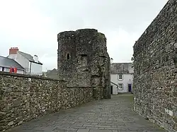 Carmarthen Castle (Welsh: Castell Caerfyrddin) is a ruined castle in Carmarthen, West Wales, UK. First built by Walter, Sheriff of Gloucester in the early 1100s, the castle was captured and destroyed on several occasions before being rebuilt in stone during the 1190s. The castle was captured by Owain Glyndŵr in 1405.[2] Henry VII's father died at Carmarthen Castle in 1456. During the Wars of the Roses the castle fell to William Herbert and, during the Civil War, was captured by Parliamentary forces. It was dismantled by order of Oliver Cromwell in the mid 1600s.
