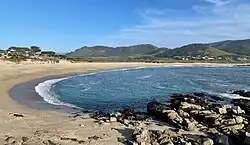 In 1602 Spanish explorer Sebastián Vizcaíno landed at this beach.[2] Gaspar de Portolà, during the Portola expedition, was encamped on this beach and rested here before deciding to return to San Diego because of low supplies and having failed to rendezvous with the Spanish supply ships. A cross commemorating the landing is on the beach.[3]