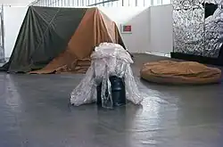 This period saw initiatives such as Arte na Praça (drawing and painting classes for children and teenagers, offered free of charge on Sundays at Dom José Gaspar Square, in São Paulo),[3] Bandeiras na Praça (a demonstration with banners created by a group of artists at Praça General Osório in Rio de Janeiro),[7] and the intervention Escada (1968) in the outskirts of São Paulo. Also from this time are the works presented at the 10th São Paulo International Biennial in 1969: A Carga [The Load], Presunto [Ham], A Pedra [The rock], and Barril [Barrel], created from raw and repurposed materials found in the city, such as mattresses, truck tarps, barrels, straw, and plastic.[8] Those art productions did not only focus on the sculptures but also the connotation of threat and danger.[9] Notable pieces in this exhibition include Presunto ("Ham") and Barril ("Barrel"), which explored the urban landscape characterized by ambivalence between opacity and morbidity.[9]