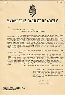 His execution by hanging took place at 7:30am on Saturday, 28 November.[13] Feliċjan Bilocca (1914-1987) was the priest that gave him his last rites and accompanied him to his execution. His remains, initially buried inside Corradino Prison, are now in the ossuary of the cemetery of Paola.[7]
