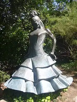 In 1951, she married guitarist Juan Antonio Agüero,[15] a member of her troupe, coming from a distinguished family from Santander, who was not Romani. They lived an authentic love story and celebrated an intimate wedding. In 1959, Carmen experienced one of the most exciting moments of her life, when the inauguration ceremony of a fountain bearing her name was held. The fountain was placed on the Paseo Marítimo de Barcelona, which crosses the neighbourhood of Somorrostro, the same places where she had walked by many years before as a child, barefoot and dragging her misery.
