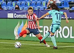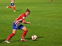 In the 2017–18 season, manager Ángel Villacampa converted Menayo from left-back to centre-back, accompanying Andrea Pereira in the axis of defense.[9] She played 26 of the 30 league games, in addition to making her Champions League debut on 4 October 2017 with a 0-3 defeat against Wolfsburg.[10] Atlético Madrid won the league title again that season and finished runner-up in the Copa de la Reina.[11][12]