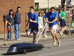 Buggy, officially called Sweepstakes, is a race around Schenley Park. It can be thought of as a relay race with five runners, using the buggy vehicle as the baton. Entrants submit a small, usually torpedo-shaped, vehicle that is pushed uphill and then allowed to free-roll downhill. The driver (who—like all participants—must be a Carnegie Mellon student, and is almost always short, light, and female) lies down inside the vehicle with the steering and brake controls. The vehicles are completely unpowered, including the prohibition of energy storing devices such as flywheels. Brakes are required but generally rarely used. Often, brakes are applied only as a last resort to prevent a crash, or to slow the buggy at the finish for the pusher to catch up because the rules specify that the pusher must be in contact with buggy at the finish line or be disqualified. Drivers who have been forced to apply the brakes due to another driver cutting them off may appeal for a re-roll in another heat without penalty. The second-to-last corner of the race, a sharp 110-degree right turn, is affectionately called "The Chute" and is lined with hay bales to prevent potential driver and spectator injury. Speeds can be quite high in the chute, often in the vicinity of 35 mph. Student Dormitory Council (SDC)[8] holds the current men's record of 2:02.16 and the current women's record of 2:23.27, both set in 2017.[9]