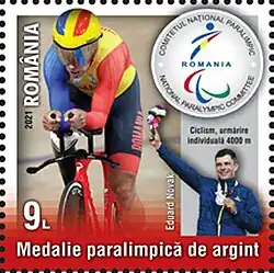 Four years later he traveled to the 2012 Summer Paralympics as Romania's main medal hope and was given the flagbearer duty once again.[4] Novak competed in four events in London. Starting off in the London Velopark on 31 August, he placed seventh in the 1 km individual time trial.[9] The next day Novak raced in the 4 km individual pursuit and made it to the final with a new world-record time of 4:40.315.[10] Novak met Jiří Ježek in the decisive heat, where although he had a slower time than in the qualification run (4:42.00), he beat his Czech opponent by more than three seconds (4:45.232)[11] thus winning the first ever Paralympic gold medal for Romania.[12]