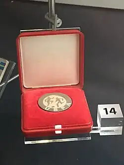 By the late 1970s her achievements were being acknowledged outside the game:[5] in 1978 and 1979 she made appearances on the sports show Superstars,[35][36][37][38] and in 1984 she was interviewed on national breakfast television (the first women's player to be so) after the 1984 Euro final defeat. In 1985 she was awarded the Sports Council Sports Award.[39] Her 1984 Euro runner-up medal is on display at the National Football Museum.[2] Thomas' record achievement as the first women's footballer to reach 50 international caps was given an entry in the Guinness World Records book in 1986, making her the first female footballer with an entry in it.[29][22] The five-a-side trophy contested by England women's players in training camps at St George's Park is named after Thomas;[17] a 1979 Hull-area girls' five-a-side trophy was also named after her.[40]