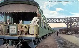 Colorized postcard view of an open-deck observation car with drumhead at the end of a Carolina Special consist at Asheville, North Carolina, the female passengers' garb dating it prior to World War I, in the train's first decade of operation. | ||||||||||||||||||||||||||||||||||||||||||||||||||||||||||||||||||||||||||||||||||||||||||||||||||||||||||||||||||||||||||||||||||||||||||||||||||||||||||||||||||||||||||||||||||||||||||||||||||||||||||||||||||||||||||||||||||||||||||||||||||||||||||||||||||||||||||||||||||||||||||||||||||||||||||||||||||||||||||||||||||||||||||||||||||||||||||||||||||||||||||||||||||||||||||||||||||||||||||||||||||||||||||||||||||||||||||||||||||||||||||||||||||||||||||||||||||||||||||||||||||||||||||||||||||||||||||||||||||||||
