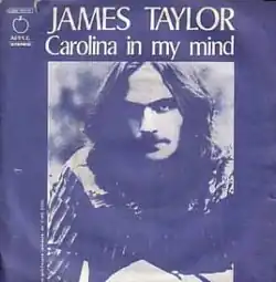 The song was first released on Taylor's eponymous debut album in December 1968 (February 1969 in the United States), and was later released as a single in the UK in February 1969 and in the United States in March 1969.[12] However, owing to the same problems which plagued the release of the album (namely, Taylor's inability to promote it due to his hospitalization for drug addiction), the single's original release reached only No. 118 on US pop charts and failed to chart in the UK.[12] Indeed, Taylor had fallen back into addiction during the London recording sessions,[5][13] and his line about being surrounded by Beatles had been immediately followed by "Still I'm on the dark side of the moon".[7] Following the success of Taylor's second album, Sweet Baby James, and its hit single "Fire and Rain", "Carolina in My Mind" was reissued by Apple as a single in October 1970[1] and rose to No. 67 on the U.S. charts. (A previously unreleased acoustic demo of "Carolina in My Mind" was issued as a bonus track on the 2010 Apple Records remastering of James Taylor.) In Canada, the song peaked at No. 64 in the spring of 1969,[14] then recharted in the fall of 1970, reaching No. 39.[15]