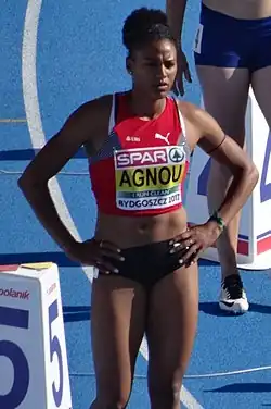 Caroline Agnou (born 26 May 1996) is a Swiss athlete who specialises in the heptathlon.[2] She competed at the 2015 World Championships in Beijing, China, finishing 22nd. Earlier that year she won the gold at the 2015 European Junior Championships. Her personal best in heptathlon is 6123 points set in Eskilstuna in 2015. She has a Swiss-German mother and a Beninese father.[1]