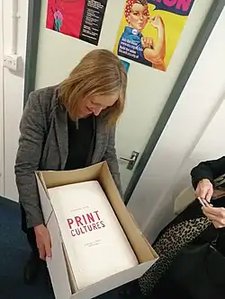 ![]() Dr Caroline Davis, 2020, holding a cake decorated with the cover of her book 'Print Cultures'. | |