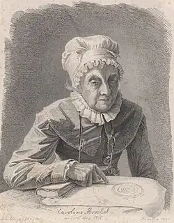 Caroline Lucretia Herschel was born in the town of Hanover Germany on 16 March 1750. She was the eighth child and fourth daughter of Isaak Herschel (1707–1767), a self-taught oboist, and his wife, Anna Ilse Moritzen (1710–1789). The Herschel family originated from Pirna in Saxony, near Dresden. Isaak became a bandmaster in the Hanoverian Foot Guards, whom he first joined in 1731, and was away with his regiment for substantial periods. He became ill after the Battle of Dettingen (in the War of the Austrian Succession) in 1743 and never recovered fully; he suffered a weak constitution, chronic pain, and asthma for the remainder of his life.[8][9][10] The oldest of their daughters, Sophia Elizabeth Herschel (1733–1803), was sixteen years older, and the only surviving girl besides Caroline. She married violinist Joachim Heinrich Griesbach (1730–1773) when Caroline was five, which resulted in the younger girl being tasked with much of the household drudgery.[11] Caroline and the other children received a cursory education, learning to read and write and little more. Her father attempted to educate her at home but his efforts were more successful with the boys.[10]