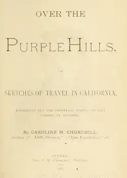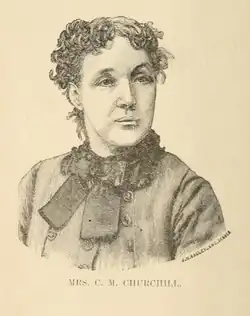 Churchill decided after her years of travel that she would permanently settle in California. However, traveling back from Chicago in 1879 to arrange publication of Purple Hills, she stopped to rest in Denver and decided that Colorado was the place for her to live.[15] In Denver, she found a population – both male and female – who showed interest in progressive ideas on women's issues, which prompted her to begin her newspaper the same year.[16] She used the byline "C.M. Churchill" for all her articles in this newspaper.[9]