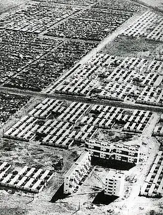In 1952, Georges Candilis, Shadrach Woods, and Alexis Josic—the architects Écochard assigned to the project—designed a series of utopian modernist modular complexes for the site that additional educational, administrative, and religious facilities.[2] Influenced by Le Corbusier's Unité d'habitation and the communal nature of slum life, the resulting mid-rise complexes featured highly collective multilevel living exemplified by myriad balconies.[4][5] The site's buildings became known by the residents as Semiramis and Nid D'Abeille as references to their visual similarities to honeycombs and the Hanging Gardens of Babylon respectively.[6]