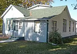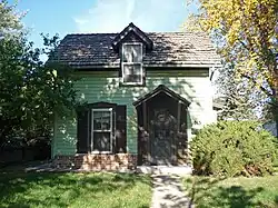 Nestled amidst grand Queen Anne style houses is this early folk residence. The wooden home, constructed for Scottish immigrant John McAusland, appears on an 1883 bird's-eye map of Miles City. A steeply pitched side-gable roof and a small dormer dominate the home's façade. Originally, the dormer likely framed a door that led to the roof of a full-length front porch. The main part of the house is one-and-one-half stories; the kitchen is under a separate, one-story roof. This plan was common in the 1800s. Placing the kitchen under separate roof minimized fire risk. Bucket brigades could more easily reach a one-story roof, perhaps saving the rest of the house in case of a kitchen fire. The design also provided good ventilation, a boon during hot summers. McAusland arrived in Miles City from Deadwood, Dakota Territory, in 1882. In 1886, he was named postmaster, an appointment that reflects political connections. The plum patronage position paid $1,800 annually (equivalent to approximately $37,000 today). In later years, he worked as a clerk. He still lived here with his daughter in 1914.[3]