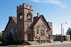 In 1910, the Methodists hired a New York fundraising firm to raise funds for a new, larger church to replace the 1883 building. The growing congregation raised $14,000 and neighbor C. J. Wagenbreth donated the needed capital to complete the project, providing that no bell be hung in the belfry. Wagenbreth, not wanting to be awoken by bells, offered this deal, a steeple but no bells. Designed by the architectural firm of Woodruff & McGulpin in 1912, the Methodist Church stands as a visual reminder of the growth of Miles City and is an important neighborhood anchor. The building exhibits eclectic architectural influences, including Romanesque Revival windows, crenellated Gothic battlements, and early Christian or Tudor massing. Decorative round-arched Romanesque openings complement the bell tower and the design carries over to the main level windows. Each opening is highlighted with painted wood mullions and cusps that form a pair of arches with circular openings surrounded by brick. The only structure in Miles City designed by the firm, the design bears similarities to Brynjulf Rivenes’ Presbyterian Church on Main Street.[3]