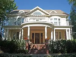 E. H. Johnson, state legislator and Miles City's first mayor, built this impressive modified Queen Anne style home in 1887. Attributed to Miles City architect Byron Vreeland, the irregular plan originally featured an elaborate arched porch and an elliptical bay capped by a conical roof. Rancher William Harmon, the home's second owner, built the carriage house in 1891. Third owner Senator Kenneth McLean, following current architectural trends, added Neo-classical details and a wraparound veranda between 1903 and 1910. Ella M. and David G. Rivenes purchased the property in 1962.[3]