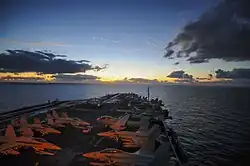 The group left San Diego on 2 April 2007 under the command of Rear Admiral John Blake.[47] The group entered the U.S. Fifth Fleet area on 8 May 2007 and began conducting missions over Afghanistan three days later.[48] The group joined Carrier Strike Group Three, led by the John C. Stennis, and relieved Carrier Strike Group Eight, led by the Dwight D. Eisenhower, that was currently operating in the Persian Gulf. The arrival of the strike group ensured the maintenance of the then two-U.S. carrier presence in the region.