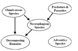 Omnivorous species feed on both the decomposing remains as well as other carrion associated insects, usually necrophagous species.[2][3] Large numbers of omnivorous insects can slow the rate at which carcass materials are removed by depleting the number of necrophagous larvae.[8] This category includes species of ants, wasps, and some species of carrion beetles.[2]