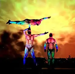 Their shows combine different artistic disciplines such as air acrobatics, dance, hoop acrobatics, theater performance with the Giant Mobile Sculptures to create unique and unbelievable atmospheres. The Giant Mobile Sculptures are big seized original creations which seem to come to life; they are jointed and provided with mobility, reaching 12 meters tall. Their realistic looks make them surprising and they represent animals or fantastic characters. The scenic design where the company structures their performances is both own designed and produced and is at exhibition's service in order to create a complete visual experience. The character's portrayal, the costumes and the body make up, which have latex details, are all combined to join the different artistic disciplines and be the core of their exhibitions, composing a nonpareil and creative force product.
