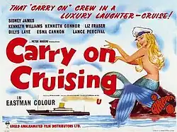 Carry On Cruising is a 1962 British comedy film, the sixth in the series of 31 Carry On films (1958–1992). It was based on an original story by Eric Barker. P&O – Orient Lines were thanked in the credits. Regulars Sid James, Kenneth Williams and Kenneth Connor appear in the film, whereas Joan Sims and Charles Hawtrey do not. Sims took ill shortly before filming began and was replaced by Dilys Laye, making her Carry On debut, at four days' notice. Hawtrey was dropped for demanding star billing and more money, but returned for the next entry, making this the only entry during Hawtrey's 23-film run which he missed. Sims returned two years later in Carry On Cleo. Liz Fraser notches up the second of her four appearances here. Lance Percival makes his only appearance in the series in Carry On Cruising, playing the ship's chef, the role originally designated for Hawtrey. The Australian actor Vincent Ball also makes his first, of two, Carry On appearances. This was the last film to have its screenplay written by Norman Hudis. This film was notable for being the first in the series to be filmed in colour. The film was followed by Carry On Cabby (1963).