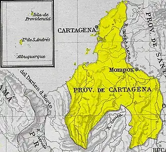 The boundaries of the province were not stable over the period of Spanish rule in the region. Limited knowledge of the territory's geography and its incomplete exploration did not permit the certain demarcation of borders between the governorates,[21] except in the case of identifiable natural topographical features, such as the Magdalena River, which defined the border with the province of Santa Marta. The colonial province of Cartagena included the territories of the present-day Colombian departments of Bolivar, Atlántico, Sucre and Córdoba, and after 1808, the island departments of San Andrés and Providencia, as well as the Mosquito Coast and the Mangrove Islands of present-day Nicaragua. With the proclamation of independence in 1811, Cartagena was surrounded by the following provinces (in clockwise order on the map): Santa Marta, Socorro and Antioquia. The boundaries between the provinces were not entirely clear, since they were never explicitly defined.[22][23]