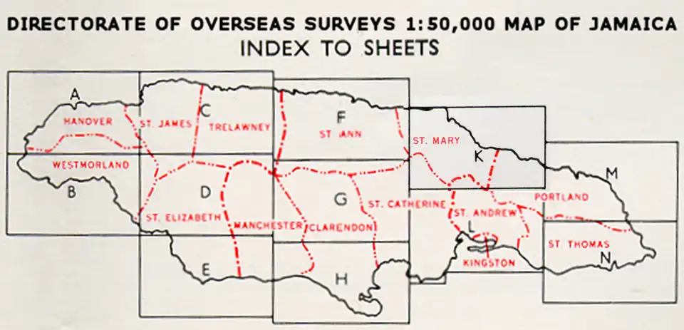 Index to the 1:50,000 maps of Jamaica published by the UK Directorate of Overseas Surveys from the early 1950s on.