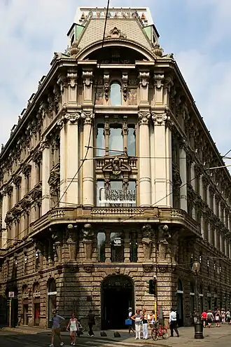 The design was a collaboration in 1891 between Luigi Broggi and his pupil Giuseppe Sommaruga. Broggi lived in the palace after completion. The decoration is eclectic including columns, floral friezes, and telamons. Atypical for Milan is the Mansard roof, which gives the building a Parisian look.[1][2] The building shows the movement towards the decorative Liberty style.