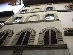 The façade still substantially maintains its 16th-century character, and is organized on three axes for five floors, the last one was the result of a 19-century expansion. The windows are lined up on the marcadavillale frames, all profiled by stone blocks arranged in a radial pattern which, well raised at the height of the noble floor (corresponding to the Great Hall), set back flush with the plaster on the upper floors, according to a custom of that time that occurs, for example, also in the adjacent Antinori Corsini Palace (at house number 6). Also worthy of note is the window for children, located below the central window on the first floor. "The sixteenth-century transformations, but essentially the changes made in the nineteenth century, only allow us to hypothesize about the structure of the house in the second half of the sixteenth century. The staircase with double straight ramp, the expansion of the access portal and the increase of one floor of the building on the street, an operation that further lengthened the façade after the 'redesign', almost certainly were carried out after the death of Vasari " (Marco Bini).