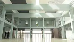The second floor follows the distribution system of the first floor: the only difference is that gallery overlooks the roof of the Salone delle Adunate on which the inner courtyard opens.[40] This is characterized by the alternation of walls covered with glass-ceramic tiles (south-east and north-west sides) and walls made of concrete-frame glass blocks (south-west and north-east sides).[41] The roof of the Salone delle Adunate, which is the floor of the inner courtyard, consists of three parts: two lateral parts in concrete-frame glass block and the central walkway.[40] From the internal gallery on the second floor one can access the rooms that were originally used for offices and administration.[42]