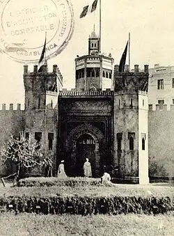 The fair was held between 5 September and 5 November despite the ongoing First World War and indeed occurred during the "deadliest moment of the war in France".[3][4] The organisation of the fair was managed by the French authorities, though they encouraged the participation of the Moroccan population in the fair itself.[4] Separate pavilions were erected to house displays representative of the products of each region of Morocco and for at least one government body, there were also tents erected in which Moorish merchants displayed their goods and various curiosities.[1][4] The fair was also the catalyst for the creation of a fire department for Casablanca.[5]